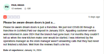 This trustpilot review by a customer of Dream Doors, part of the Neighbourly group, got me thinking about what other Franchisors would do in the same situation. The deposit customers pay upfront for the goods or services they are buying in many franchises is 50% – 100% of the total order value and in the case of high value products like kitchens, bathrooms, shutters or blinds can end up being tens of thousands of pounds.